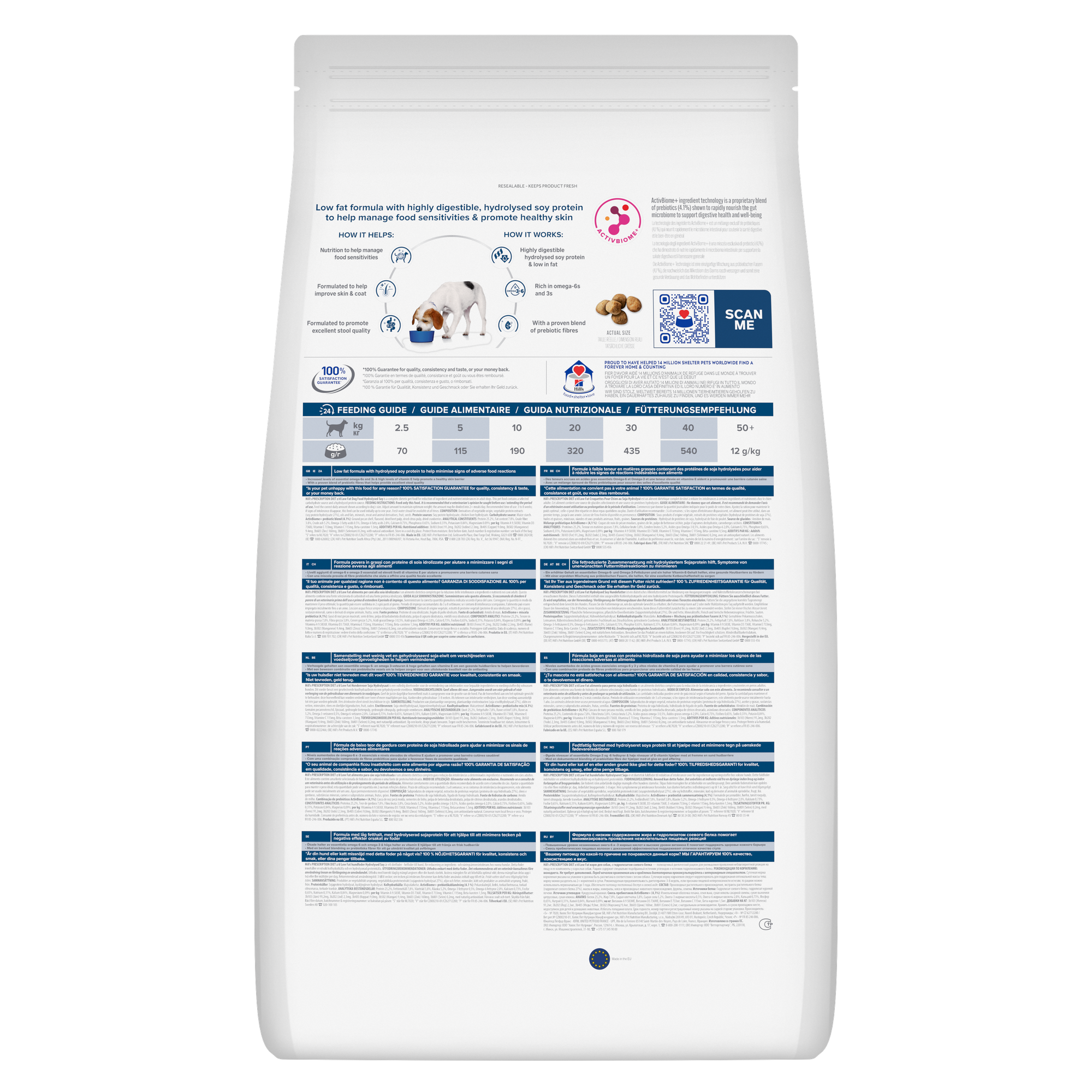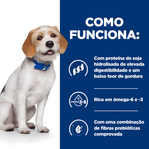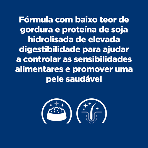 Nutrição clínica especialmente formulada com proteína de soja hidrolisada e baixo teor de gordura para evitar reações adversas alimentares, promovendo simultaneamente uma pele saudável em cães com sensibilidades alimentares e à gordura.