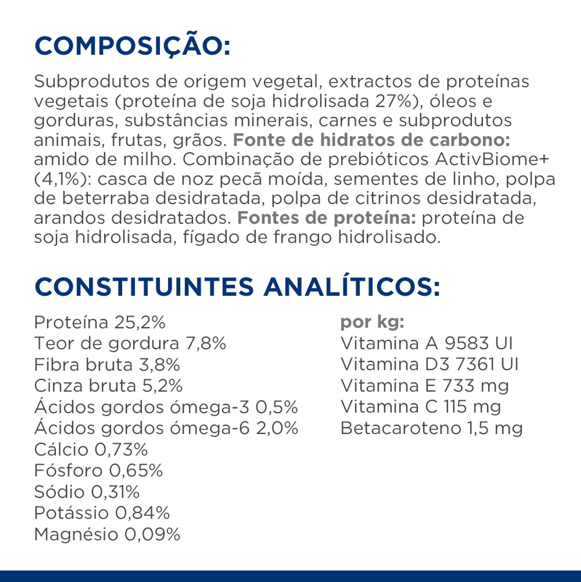 Soja hidrolisada: amido de milho, proteína de soja hidrolisada (27%), celulose, substâncias minerais, óleo de soja, fígado de frango hidrolisado, casca de noz pecã moída, óleo de coco, gordura animal, sementes de linho, polpa de beterraba desidratada, polpa de citrinos desidratada, óleo de peixe, vitaminas, arandos desidratados, oligoelementos e betacaroteno. Com um antioxidante natural (mistura de tocoferóis).