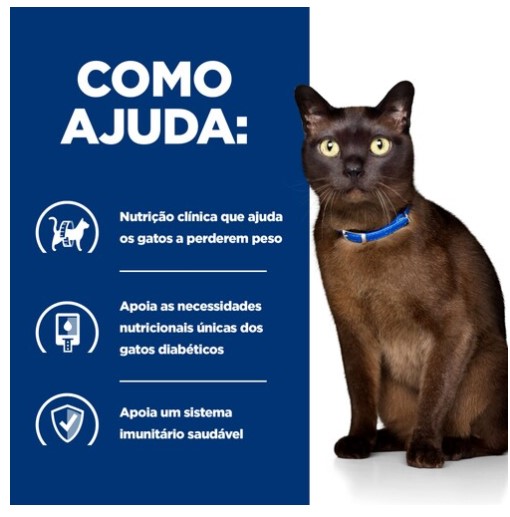 Juntamente com o exercício frequente, escolher o alimento certo é muito importante para ajudar os gatos a alcançar o peso ideal. Nutricionistas e veterinários da Hill's desenvolveram Prescription Diet m/d, uma nutrição clínica para ajudar os gatos a perderem peso e a regularem os níveis de açúcar no sangue.