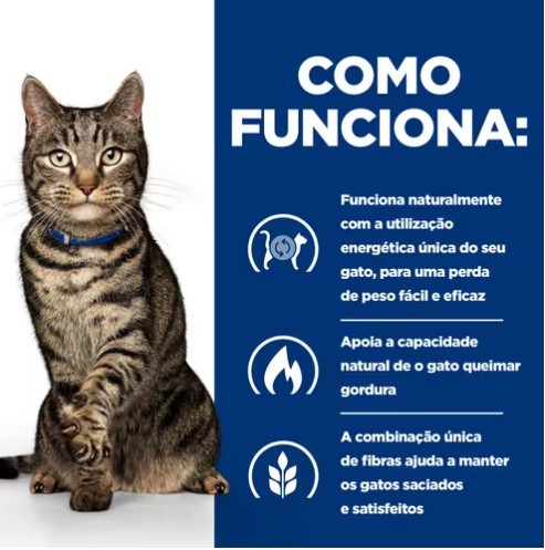 Nutricionistas e veterinários da Hill's desenvolveram Prescription Diet Metabolic, uma nutrição clínica especialmente formulada para ajudar os gatos a reduzirem e a manterem o seu peso. Funciona naturalmente com o uso exclusivo da energia do seu gato para uma redução de peso fácil e eficaz. Este alimento estimula a capacidade natural dos gatos de queimar gordura e fornece energia para momentos de diversão. A sua combinação única de fibras ajuda a manter os gatos satisfeitos e saciados. De facto, 88% dos gatos reduziram o seu peso em casa em 2 meses quando alimentados com Prescription Diet Metabolic.* Este alimento seco é elaborado com atum e tem um sabor irresistível que o seu gato irá adorar.