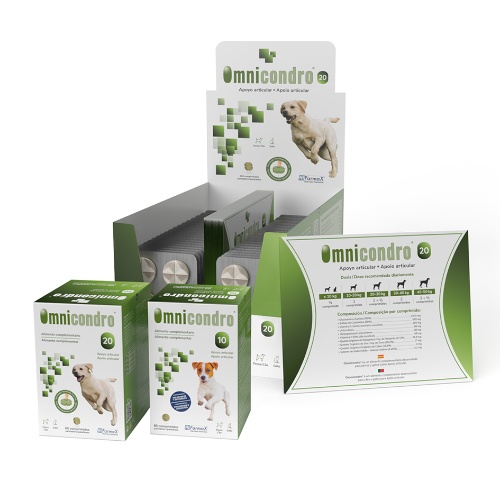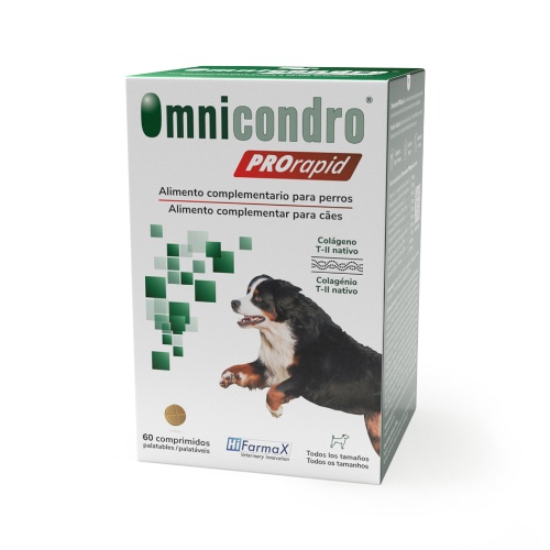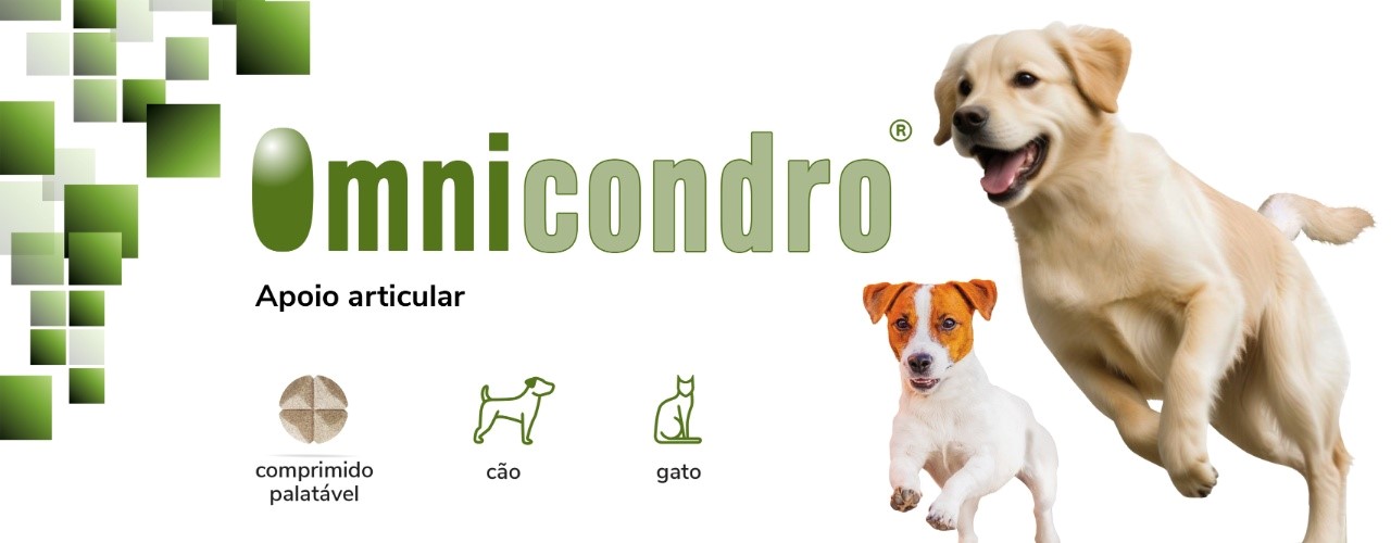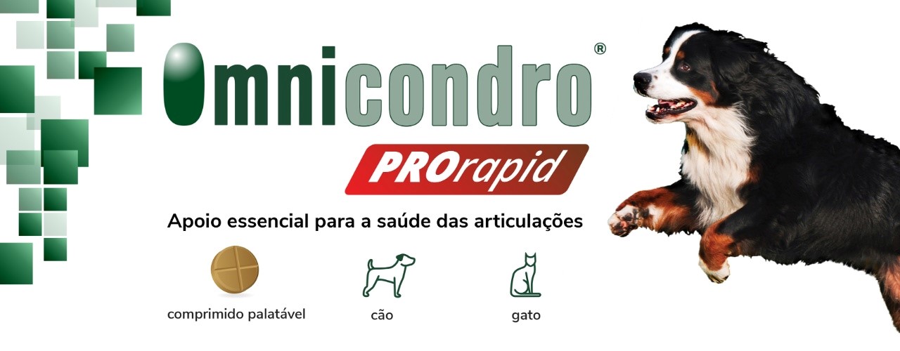 Omnicondro é o alimento composto complementar desenvolvido para apoio e lubrificação articular dos cães e gatos. Fornece ingredientes que favorecem a nutrição da cartilagem, ajudando a melhorar a resistência e flexibilidade das articulações. Omnicondro PROrapid é o alimento composto complementar de apoio às articulações de cães. A ação combinada do Colagénio Tipo II nativo com os Ómega 3 e os extratos herbáceos favorece a saúde articular, ajudando a melhorar a mobilidade dos cães.