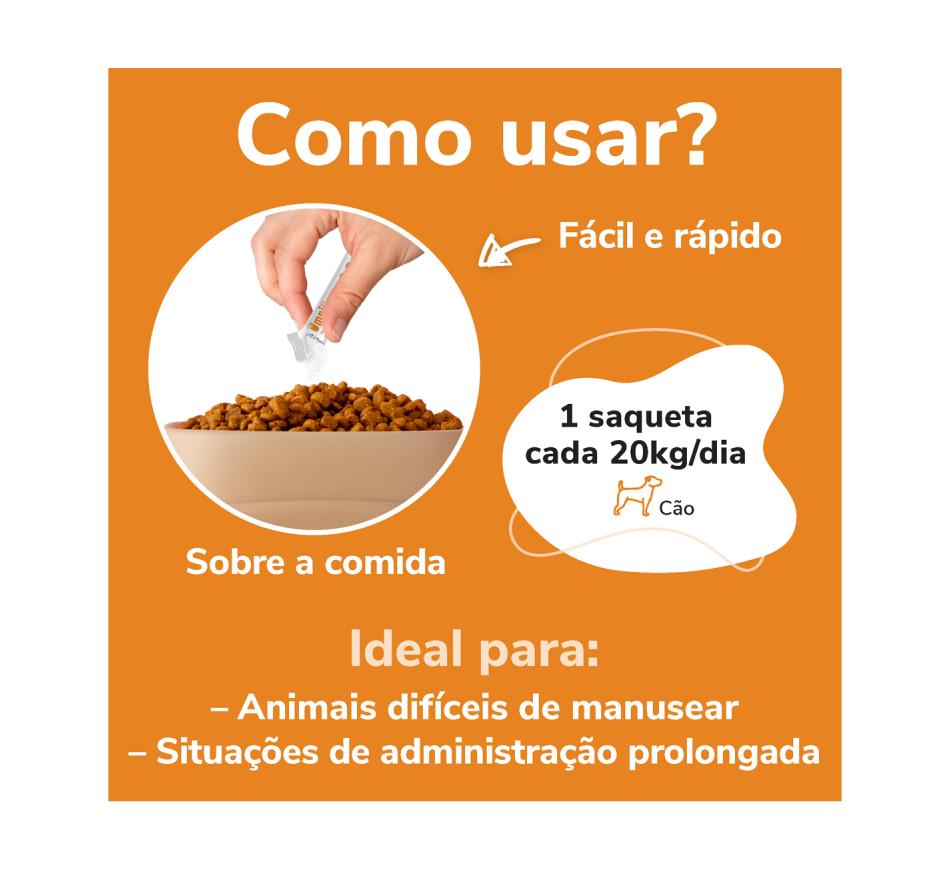 Misture o conteúdo de 1 saqueta (2 g) com a ração diária de alimento (seco ou húmido) e administre 1 saqueta por cada 20 kg de peso corporal por dia. Em casos de diarreia aguda, prolongue o tratamento durante 3–5 dias ou de acordo com a prescrição veterinária.
