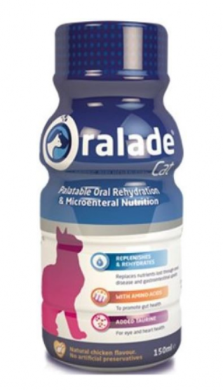 Oralade Cat tem um papel central no controlo e manutenção das doenças mais comuns dos felinos. Oralade é uma solução única, pronta a usar, que fornece uma nutrição microenteral e reidratação oral de apoio a gatos com formas agudas de mal absorção e insuficiência renal crônica. Um teor muito baixo em gordura e baixo em proteína fazem-no de fácil digestão.