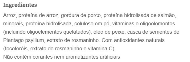 - É baseado em ingredientes com pouca probabilidade de causar uma reação, proteína de salmão hidrolisada e arroz.