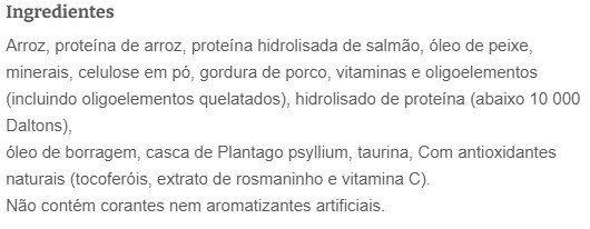 A proteína de salmão hidrolisada e o arroz são ingredientes menos propensos a desencadear reações alimentares.